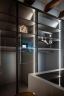 Diese Walk-in-Ankleide verkörpert luxuriösen Innenausbau in seiner architektonischsten Form. Edle Oberflächen, präzise Handwerkskunst und eine klare gestalterische Linie schaffen einen Raum, der Funktion, Ruhe und Ausdruck in Einklang bringt. Jedes Detail wurde mit Rücksicht auf die historische Substanz und mit Blick auf höchste Designansprüche entwickelt – für ein Nutzungserlebnis, das Ästhetik, Qualität und Exklusivität konsequent vereint.